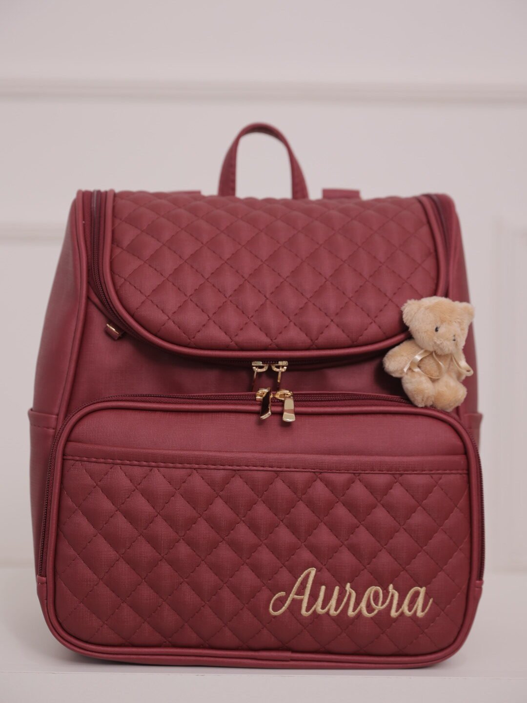 Peça confeccionada no material sintético marsala Duna com acabamento em matelassê, bordado na cor ouro, metais inoxidáveis e forro impermeável.