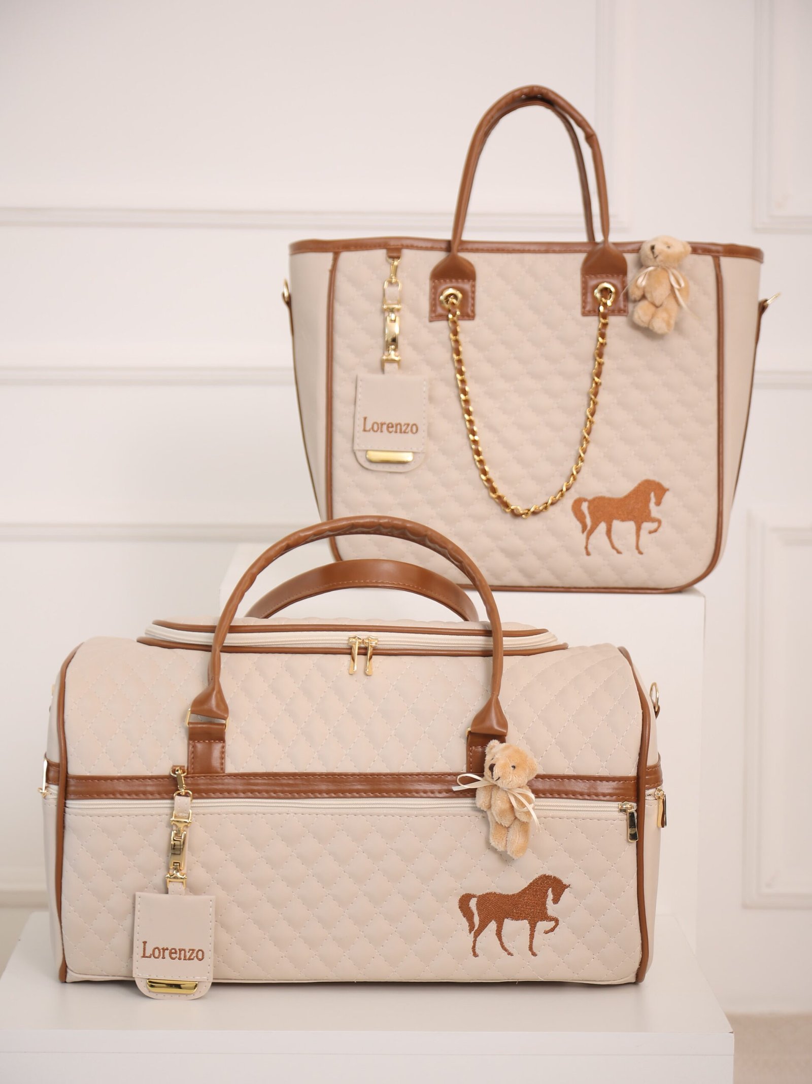 Peças confeccionadas no material bege dexter com detalhes e acabamento caramelo, as peças tem acabamento em matelassê, metais inoxidáveis e forro impermeável.