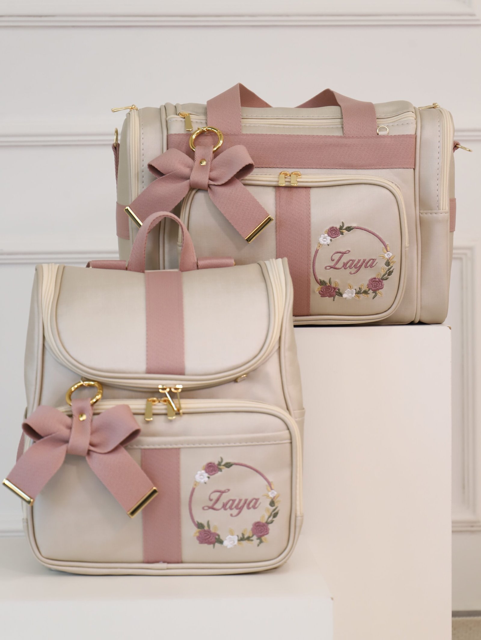 Peças confeccionadas no material sintético Bege duna sem matelassê e Fitas na cor Rose, metais inoxidáveis e forro impermeável.