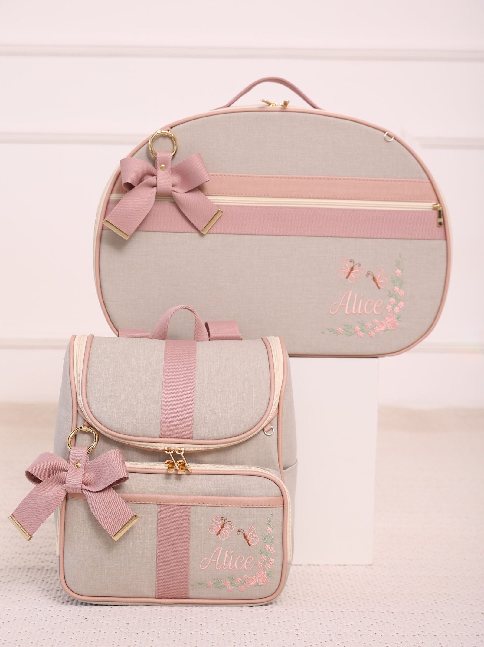 Peças confeccionadas no material Linho bege tecido com fitas na cor rose, metais inoxidáveis e forro impermeável.