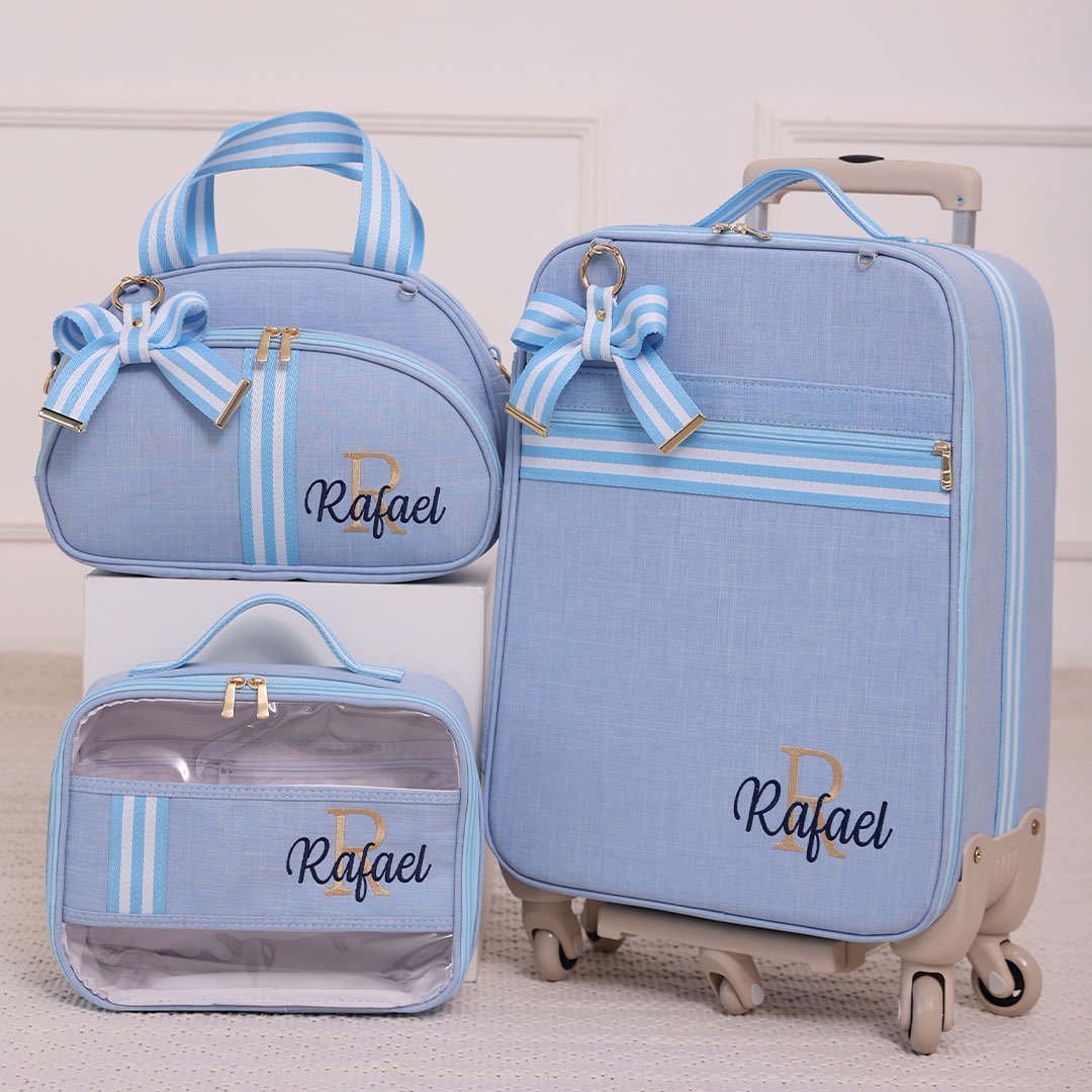 Peças confeccionadas no Linho azul bebe tecido com Fitas em algodão azul bebe com listras brancas,  metais inoxidáveis e forro impermeável.