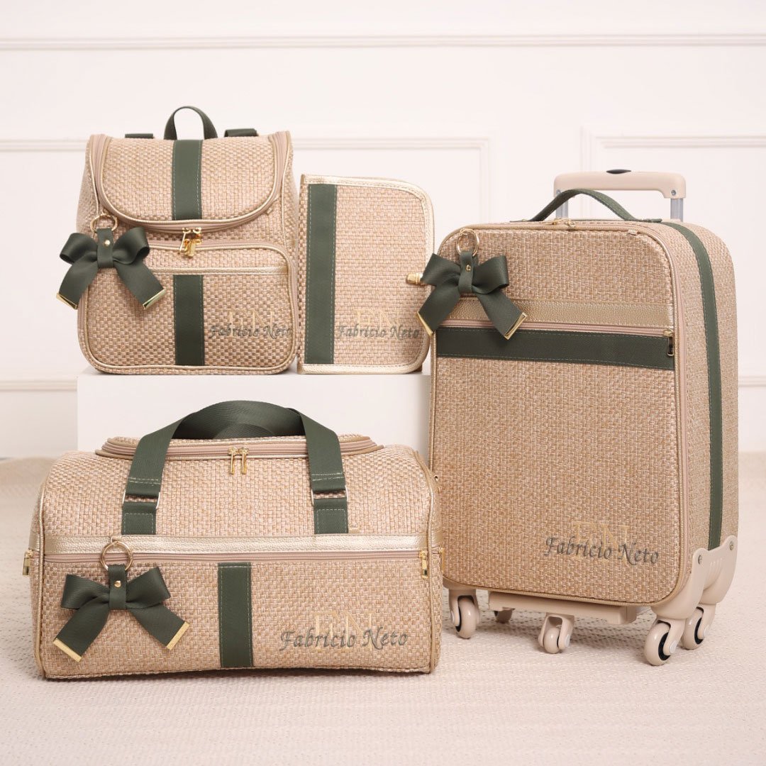 Peças confeccionadas no tecido Tressê com detalhes e acabamento no material sintético ouro com Fitas na cor verde escuro, metais inoxidáveis e forro impermeável.