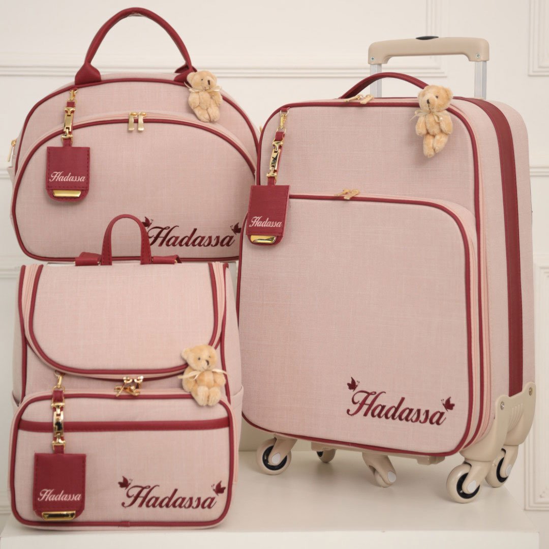 Peças confeccionadas no Linho tecido rose com detalhes e acabamento no material sintético marsala, metais inoxidáveis e forro impermeável.