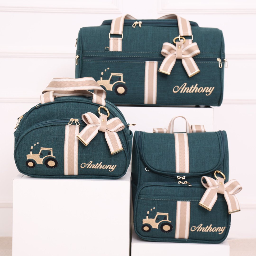 Peças confeccionadas no Linho verde escuro com Fitas na cor ouro com listras bege, metais inoxidáveis e forro impermeável.