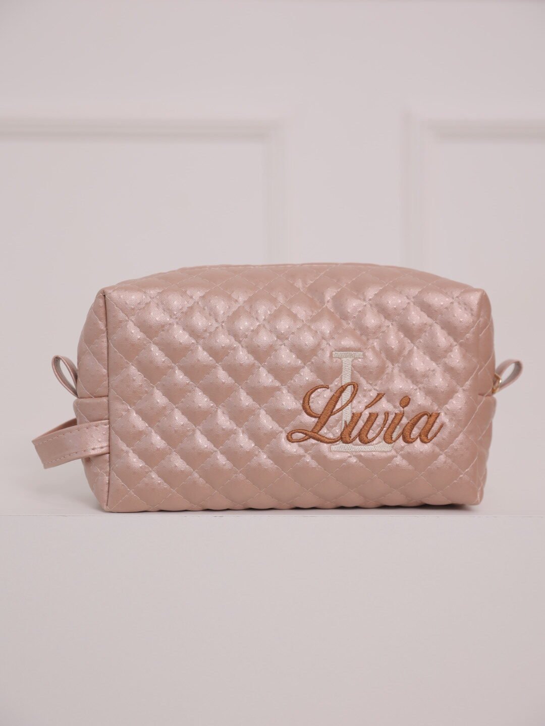 Peça confeccionada no Poa Rose sintético, com detalhes e acabamento no matelassê, metais inoxidáveis e forro impermeável.